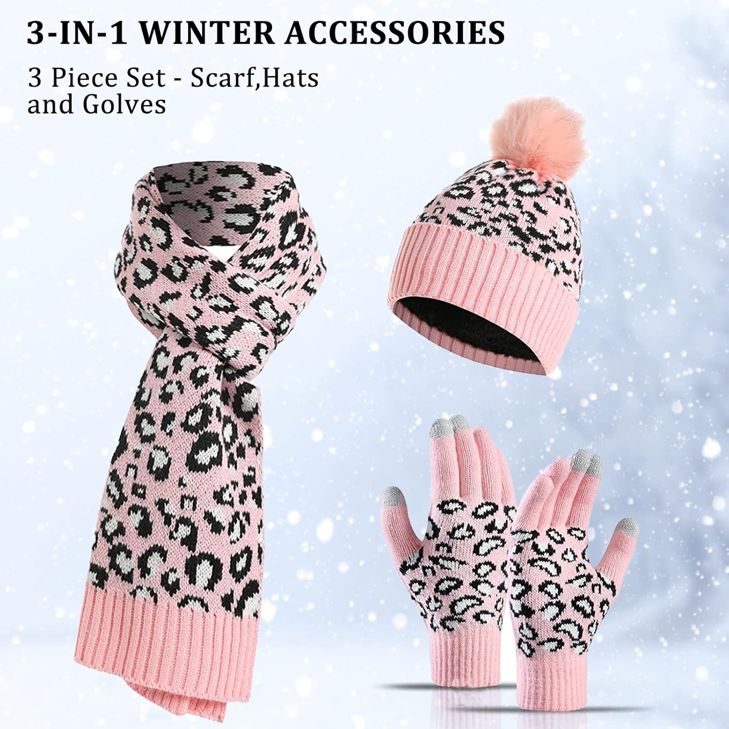 BLBAISH 3 in 1 Winter Knit Hat Scarf and Touchscreen Gloves Set for Women Thickened Lining Knit Cap Set - Leopard Style