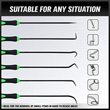 • Made of heat-treated CR-V steel and chrome vanadium steel shaft, this pick hook set is sturdy and sharp.