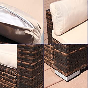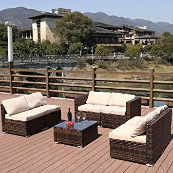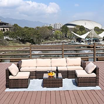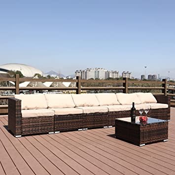 VANCIKI Garden Furniture Set of 7, Tempered Glass Coffee Table Rattan Woven Wicker Chair Sectional Sofa with Cushion Outdoor Conversation Set for Lawn, Garden, Beach, Poolside and Balcony
